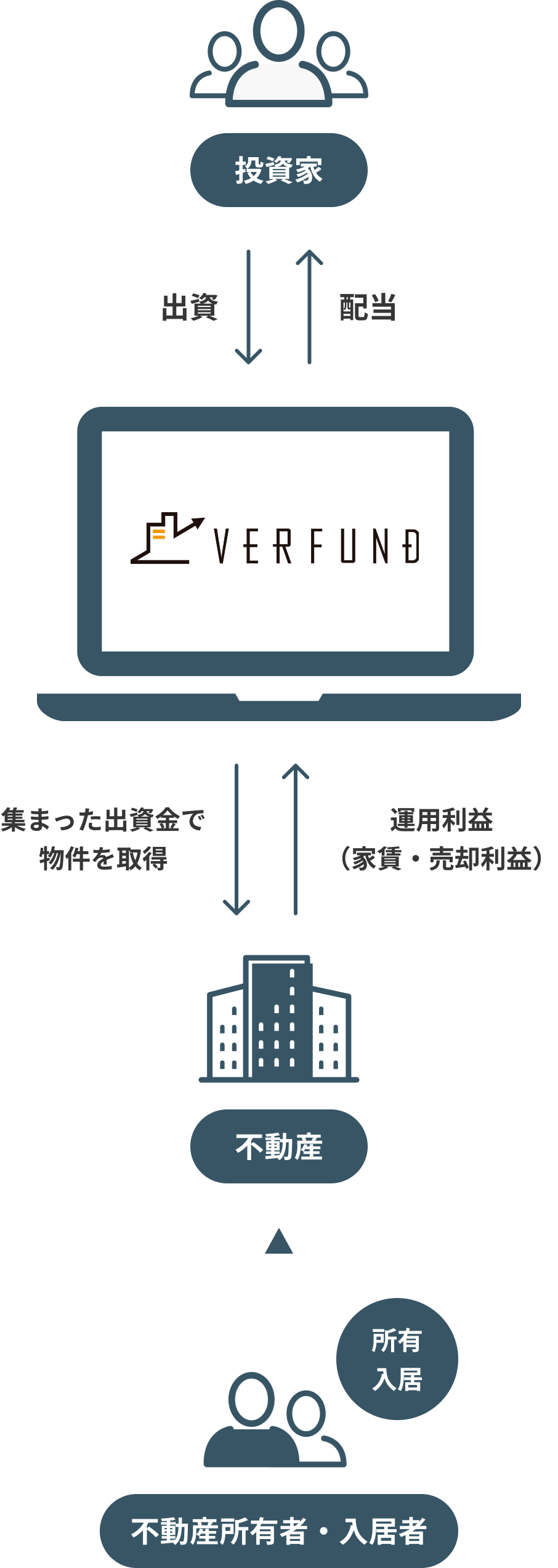 インターネットを通じてお金を運用したい投資家から資金を集めて、株式会社ベルテックスが運営する「VERFUND」(ベルファンド)を通じ不動産運用を行い、運用益や売買益を投資家に分配する仕組みです。