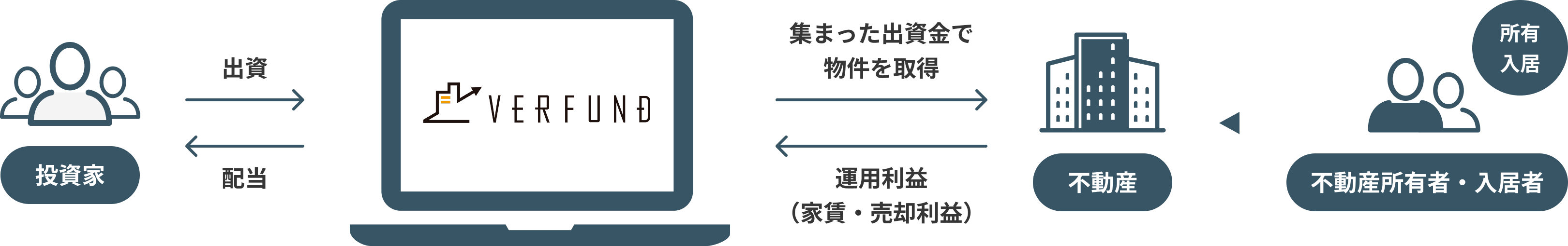 インターネットを通じてお金を運用したい投資家から資金を集めて、株式会社ベルテックスが運営する「VERFUND」(ベルファンド)を通じ不動産運用を行い、運用益や売買益を投資家に分配する仕組みです。